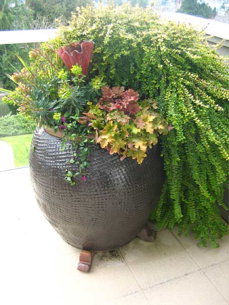 Most containers I choose for my clients are made of ceramic or clay, which includes terra cotta. Why not plastic? I will reveal my aesthetic prejudice here: Plastic is usually very unattractive and doesn’t complement anything. If you are choosing plastic to reduce the weight of your containers, try one of the new lightweight styles. These include ‘Fiberstone, ‘Clayfiber,’ ‘Crescent Lightweight,’ ‘Rotomolded plastic’ or even lightweight metal containers. The number of impressive styles available to us in the Seattle area increases each year, including many more colors.