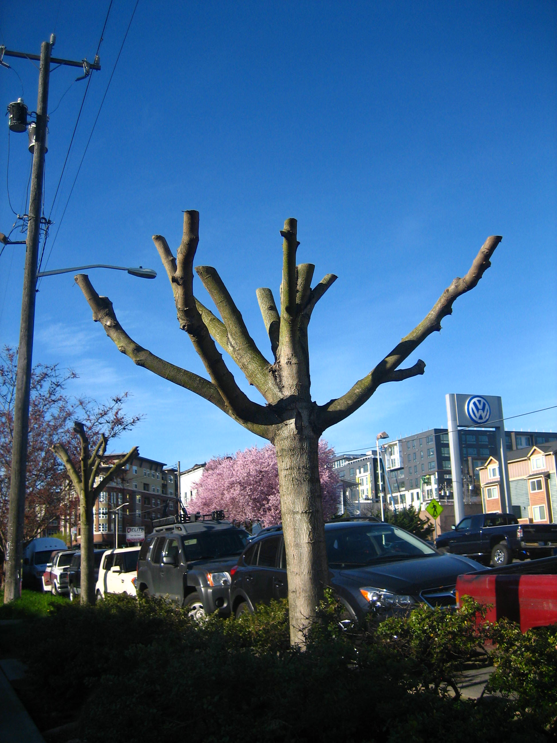 The pictures accompanying this blog posting show trees photographed in March, 2015 in the Seattle area. Standing in front of two prominent Ballard businesses, they have been topped dramatically.